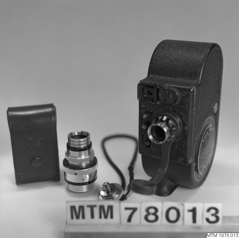 - Filmkamera för dubbel-8-mm film, normalobjektiv 12½ mm f=2.5, ett extra objektiv 1,5" f=3,5. Svarteloxerat kamerahus, tillverkare Bell & Howell, United Kingdom. Ser.nr 445837. Med instruktionsbok. Från 1940-talet.