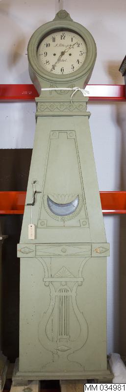 - Golvur, foder av grågrönmålad fur. Fodralet har rektangulär nederdel med lyra i relief, uppåt avsmalnande mittparti med lucka med lås och nyckel samt halvmånformad glastäckt öppning; rund huv med cirkelrund lucka. Urtavla av vitmålad metall med svarta bokstäver märkt "J Pettersson Ystad". Urverket har släphaksgång. På insidan texten "Om man vrider på skruven under lodet, kan man få klockan att forta eller sakta sig. Vrid till höger så att lodet åker upp, så går klockan fortare, två ung. fem min pr. dygn. Vrid åt vänster, så att lodet åker ner, så går klockan saktare."