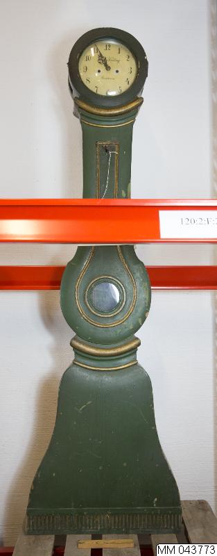 Govur, verket av Anders Kieding, Landskrona. Fodral i bondrokoko, målat mörkgrönt med bronserade lister.