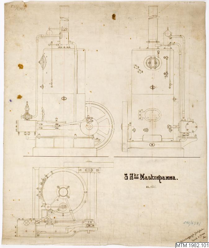 Maskinritning i tusch på ritningsväv med rubriken "3 Hkr Maskinpanna" signerad Carl Holmbergs Mek. Verkstad i Lund 24/1 1883. Vi ser i övre delen två profiler och i nedre delen en planritning.