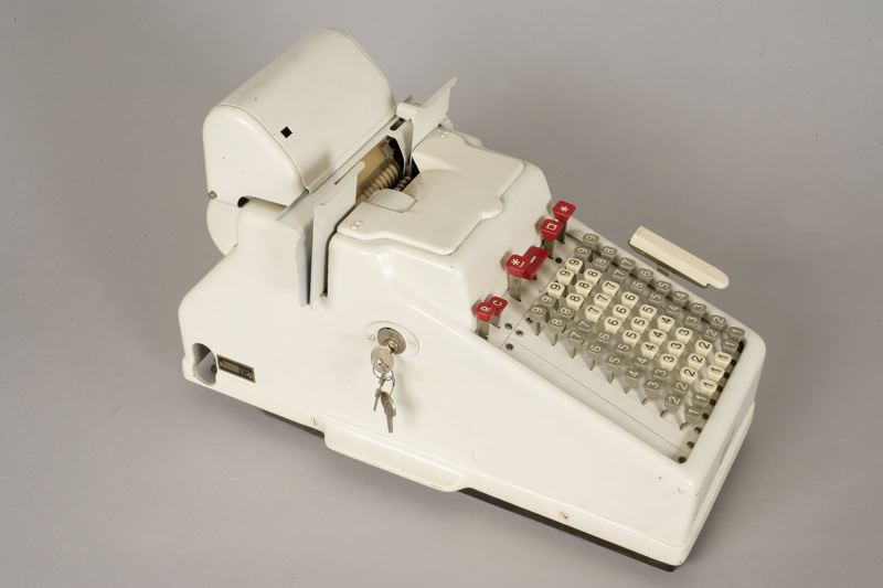 Eldriven räknemaskin med kontrollremsa.
