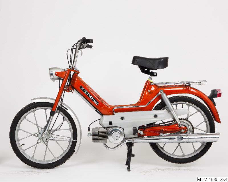 - Moped, modell Puch Maxi K från 1976 med ramnummer. 2-takts luftkyld motor med en volym på 49 cc och 1-växlad automat. Tillverkades mellan 1968-91. Även märkt: Svenska Steyr-Puch Typbeteckning TSV 1469. Tanklock saknades 2002-01-07. Hastighetsmätare från VDO graderad 0-60 km/tim. Mätarställning 0006,3.