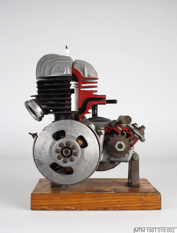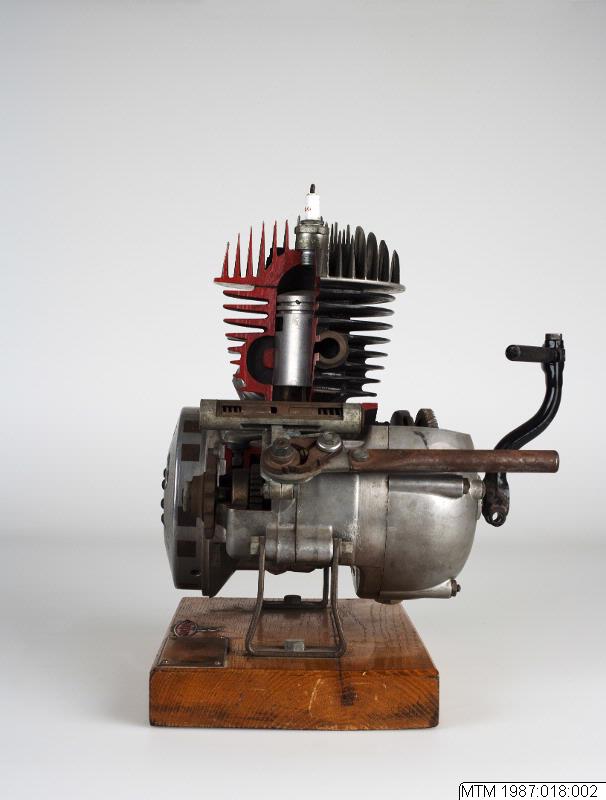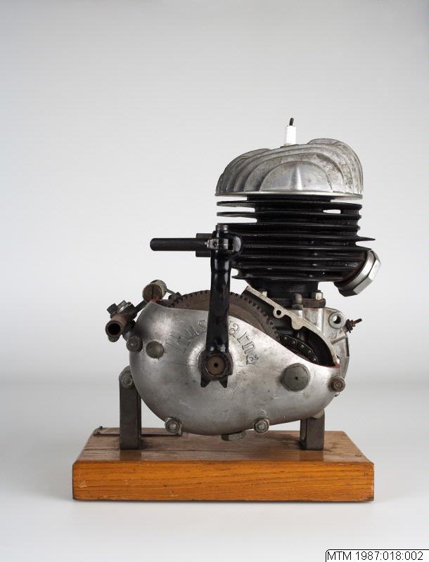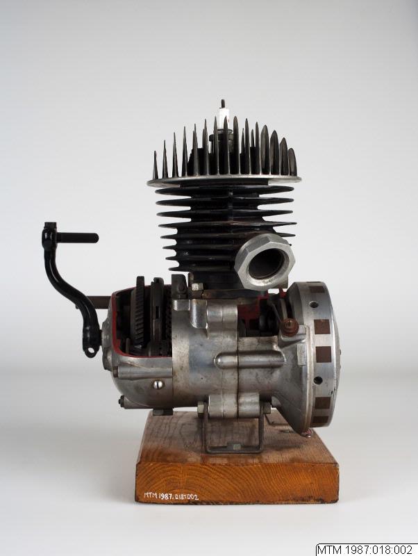 - Motorcykelmotor. Demonstrationsskuren monterad på en träplatta. Med 1 st KLG M50 tändstift samt kickstart. Graverad mässingsskylt med texten: Husqvarna Vapenfabrik A/B, Sweden, 120 cc. Typ 27.