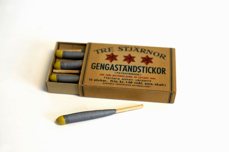 Text på asken: Tre stjärnor. Gengaständstickor (Patenterade). Fria från bestämmelserna om explosiv vara. Hantera asken varsamt. 15 stickor. Pris: kr. 1:06 (inkl. oms. skatt.). Svenska tändsticks aktiebolaget.