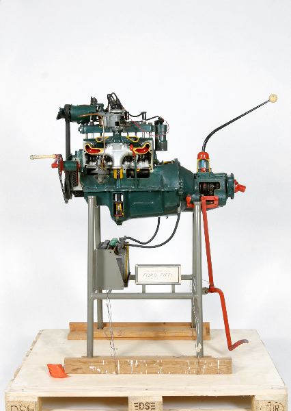 Bilmotor. Uppskuret demonstrationsexemplar med växellåda samt Noackbatteri. 4-cylindrig 4-takts radmotor till en Ford Eifel 1936. Har använts som undervisningsobjekt i donatorns fars bilskola i Kristianstad. Monterad på gråmålat järnstativ. Vikt c:a 100 kg.