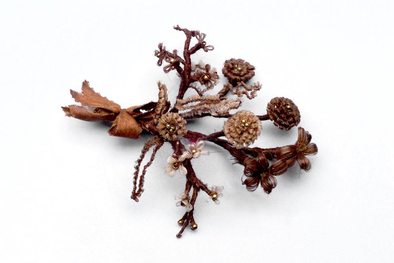 Bukett, hårarbete med guld sammanhållen av en brun sidenrosett,