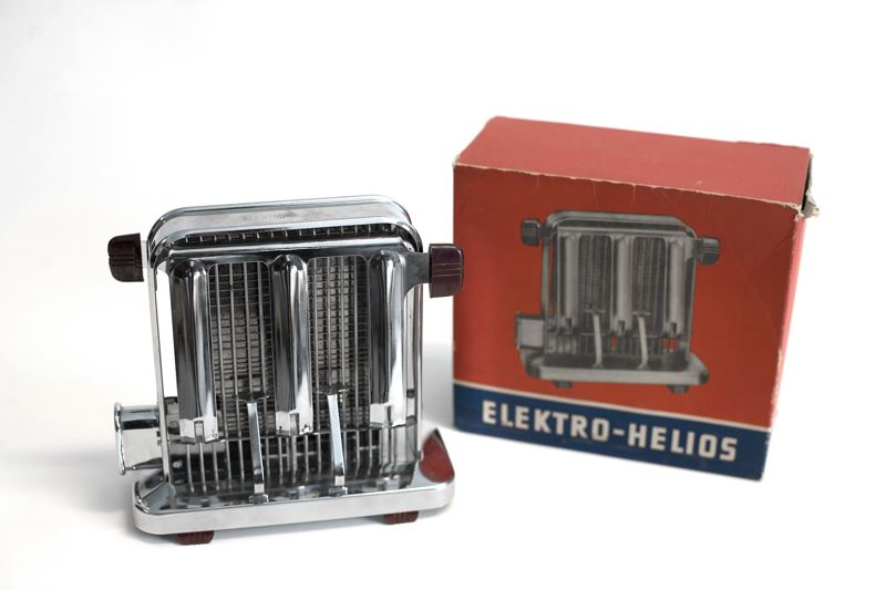 Brödrost av blankförnicklad metall. I originalkartong av papp med garantisedel, daterad 31/8 1954, Malmö Stads Gas- & Elektricitetsverk, avd. Gas- & Elektricitetsbyrån. Pris 24,75 kr.