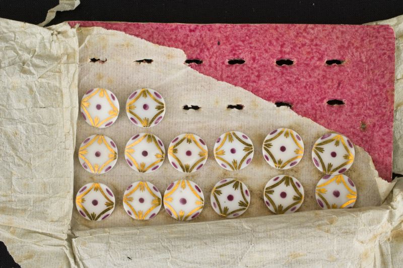 Knappar, 14 st., porslin vite med dekor i rött och guld.
