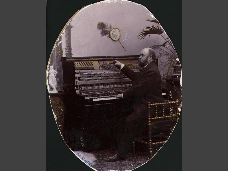 Visitkortsfotografi. Porträtt, interiörbild, av pianofabrikör Olof Svensson, sittande vid piano.