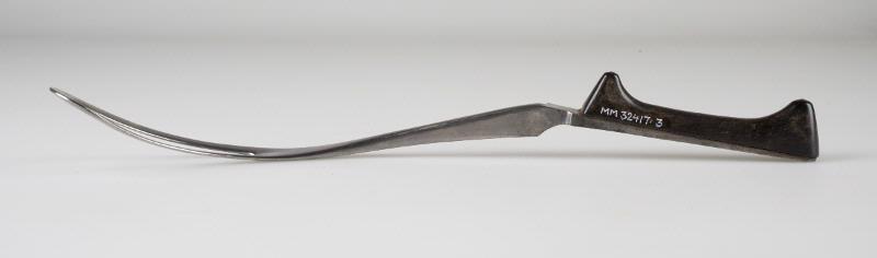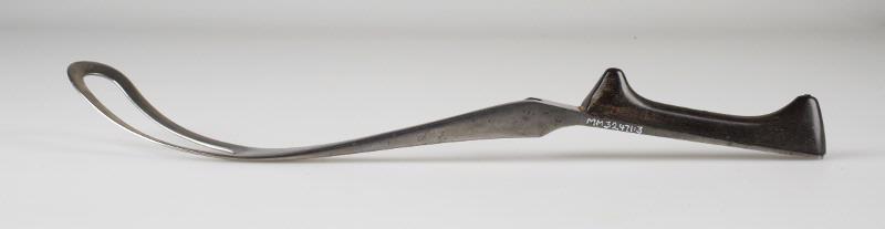 Förlossningtång av metall med handtag av trä. De två skänklarna är delbara.