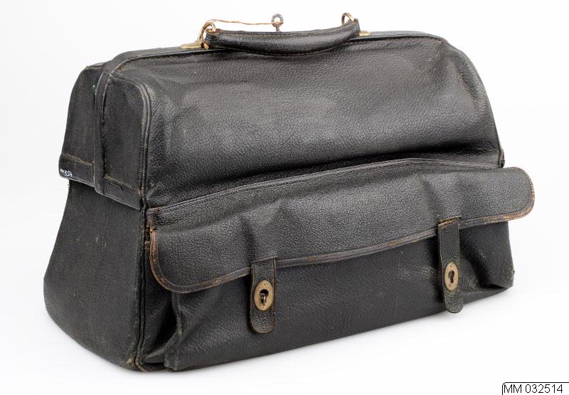 papper. Necessären består av tre invändiga fack varav två kan fällas ut från locket. I facken finns hygienartiklar så som flaskor, kam, manikyrset osv. Mycket saknas. I ett ytterfack finns skrivdon i form av blyertspenna, bläckhorn, läskpapper och reservspetsar till bläckpenna.