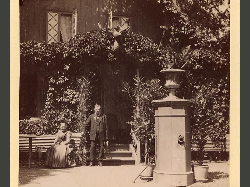 Visitkortsfotografi. Porträtt av textilhandlare Theodor Flensburg tillsammans med sin fru Emelie i trädgårdsmiljö.
