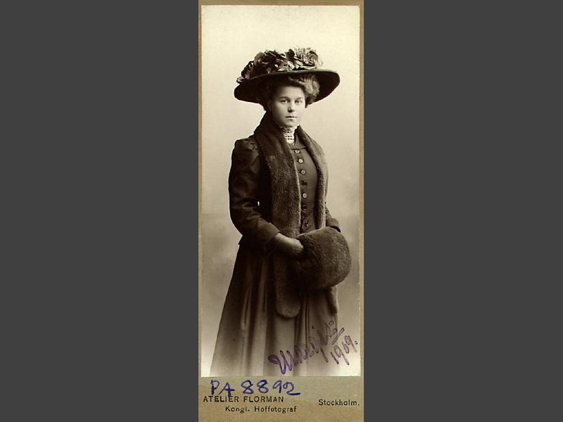 Visitkortsfotografi. Porträtt av Margit Möller i stor hatt, damkappa med pälsboa runt halsen samt hållande handmuff.
