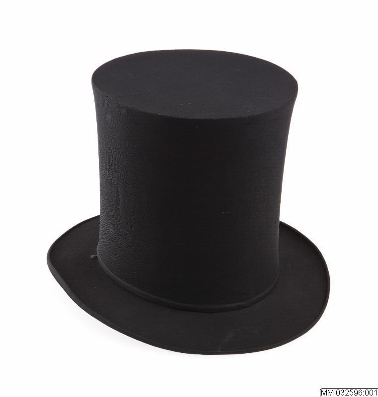 Cylinderhatt/ chapeau claque, av svart ylletyg, garnerad och kantad med smala svarta ripsband av siden. Brättet klätt med tyget. Fjädermekanism i kullen. Foder av rött siden och halvfoder av svart fodertyg.