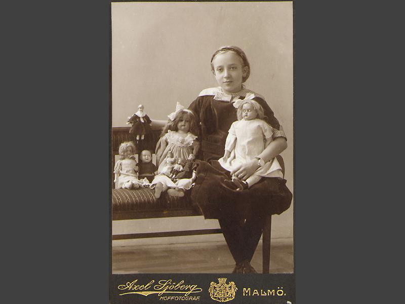 Visitkortsfotografi. Porträtt i helfigur av Gungild Sjöberg, sittande på soffa med dockor.