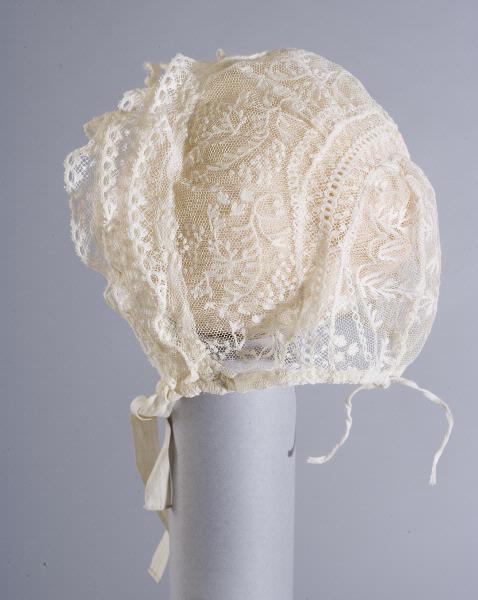 bomullsgarn. Infälld maskinknypplad spets runt nackplattan. Tre dragskokanaler längs framsidan, regleras på hjässan, alla tre kanaler är garnerad med vita knypplade spetsar. Dragsko i nacken. Knytband av vita bomullsband.