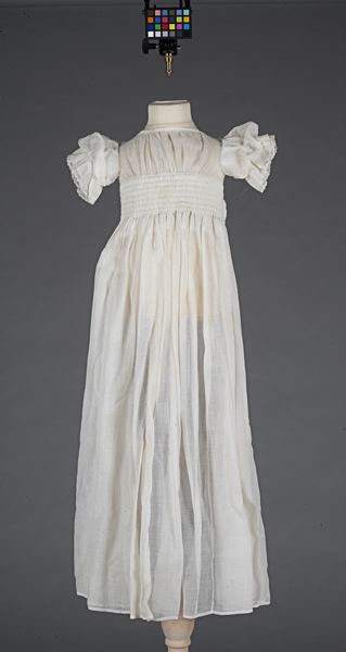 Dopklänning av tunnt vitt bomullstyg. Liv och kjol sammansydda. Livet