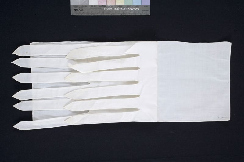 Gördel av bomullstyg, sydd i dubbelt ty. Underdelen slät, överdel har 6 knytband i varje ände