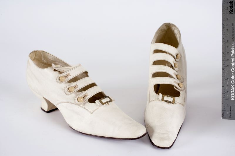 Brudskor, 1 par. Sula av ljusbrunt läder, klack av trä, klädd med vitt