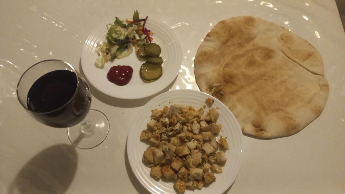 "Små bitar av kyckling, Cola, pickled gurka, bröd och tomatoketchup.