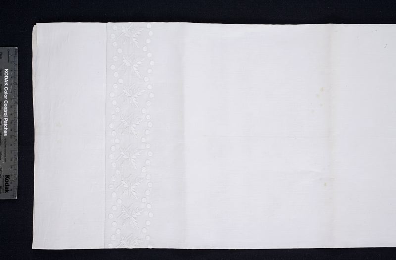Barnlakan av tunnt, vitt linne. Ena kortsidan har en broderad bård i plattsöm av vitt lingarn. Fållen uppsydd med en otroligt liten hålsöm. Motsatta kortsidan fållad för hand.