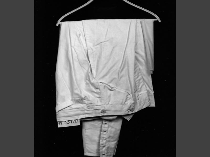 Ridbyxor av vitt halvsiden. Byxbenen knäpps nedtill med knappar och knapphål. Linning med knappar. Spänntampar med spännen vid sidorna under linningen.