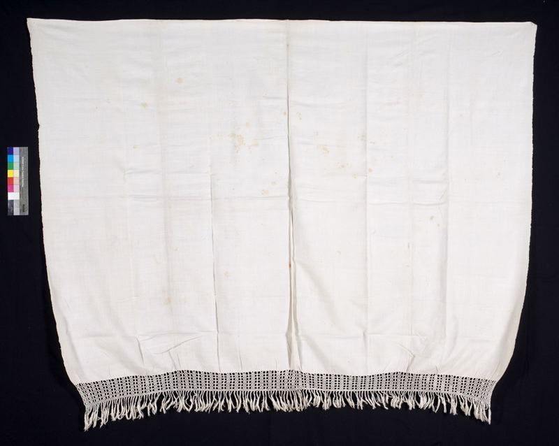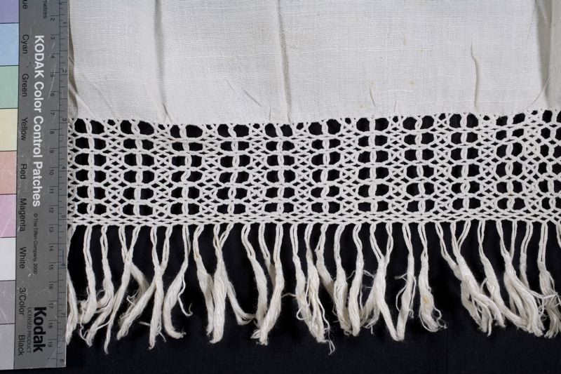 Hängkläde eller slagbordsduk, av linnelärft, 2 ihopsydda våder, hemvävt. Nedtill fransflätning av