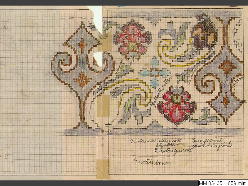 Vävmönster, bluerts-och färgkritteckningar på vitt dubbelvikt papper.
