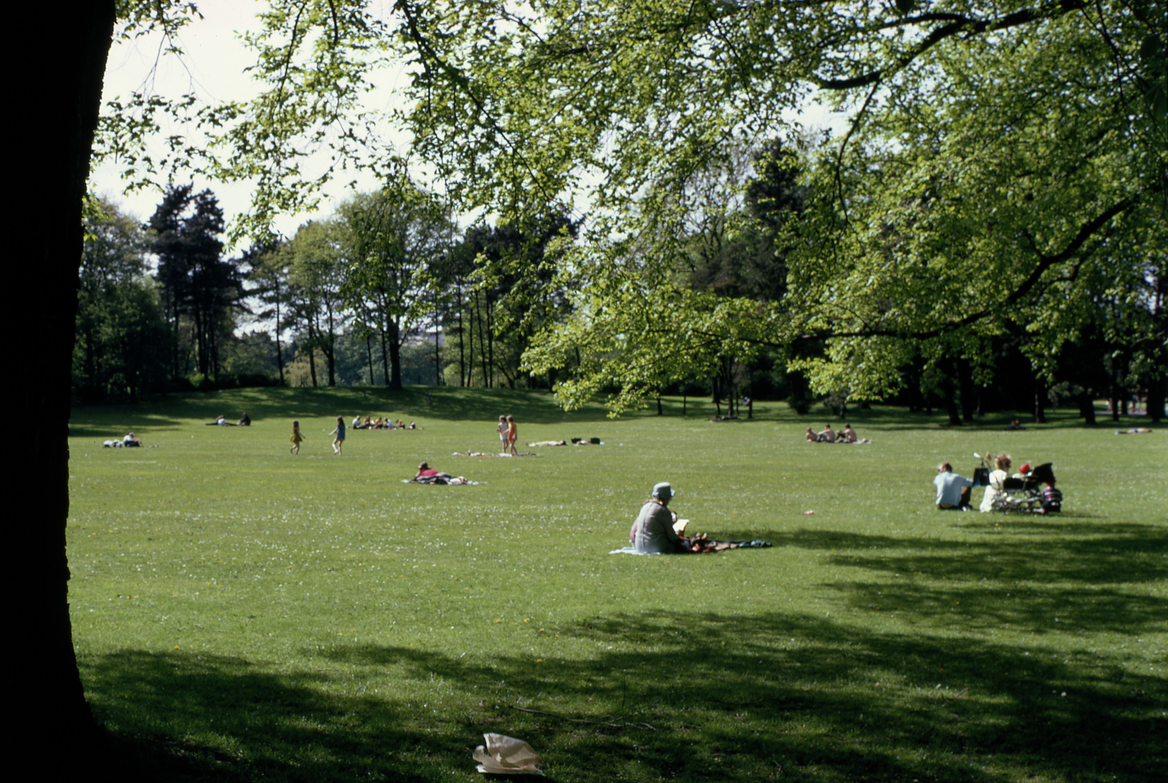 Människor på gräsmattan i Slottsparken.