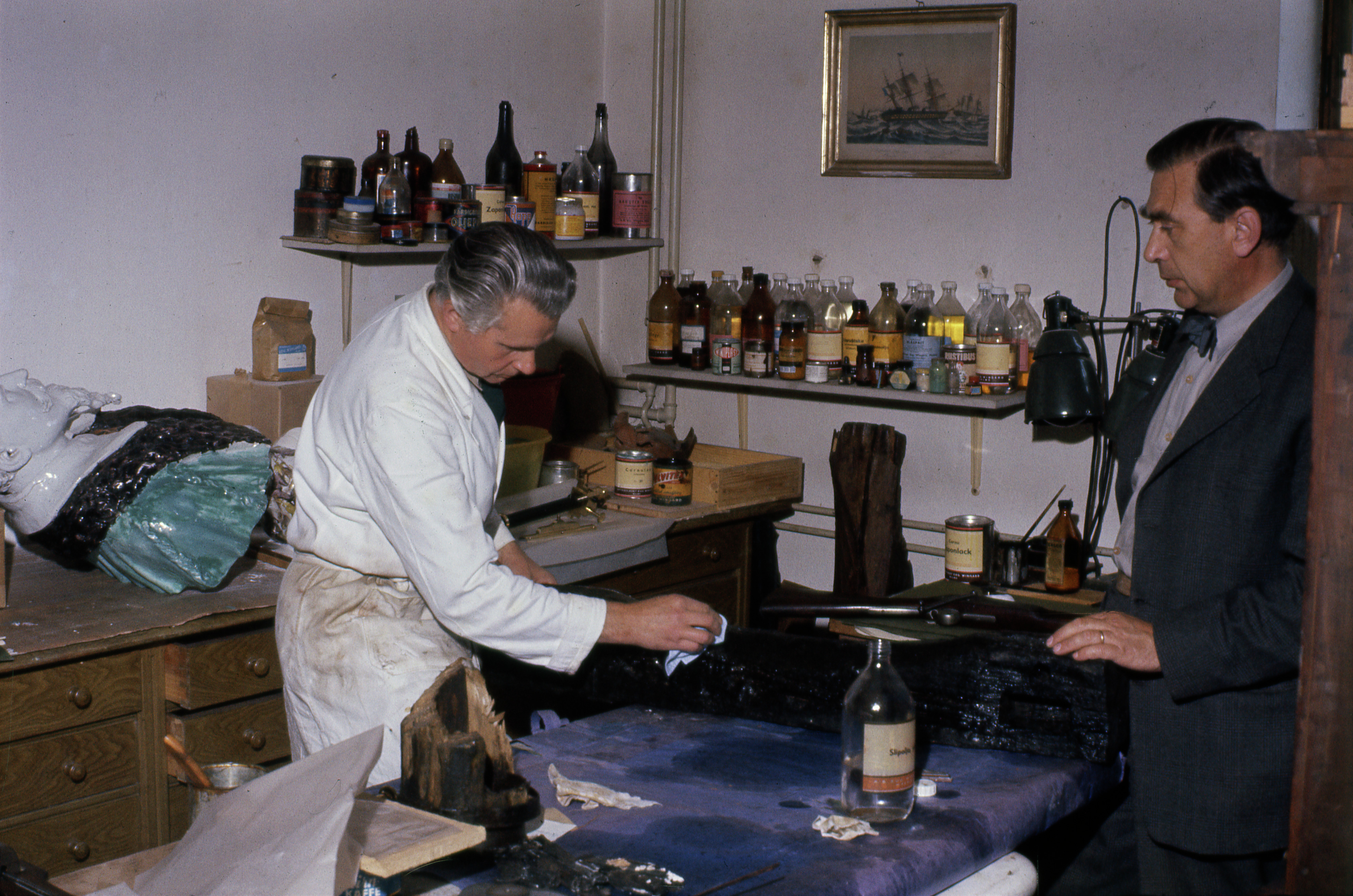Två män med flaskor och burkar med bland annat slipolja, lack.