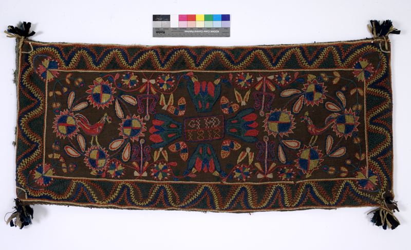 Åkdyna, broderi i stjälk-, kedje- och korsstyng på tuskaftat brunt ylle,