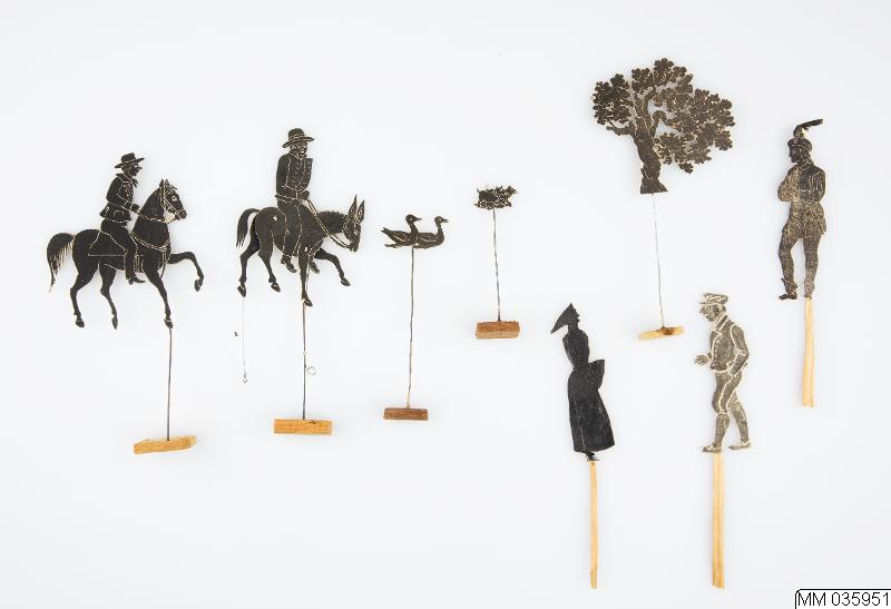 Skuggspel, för dockteater, svart tryckt papper med perforerade linjer, uppfodrat på kartong.