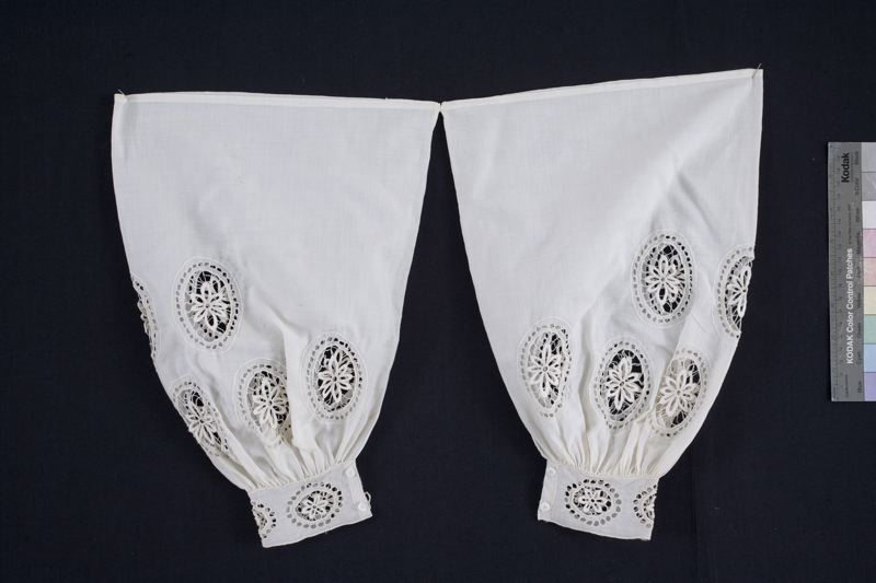 Av vitt bomullstyg broderade med langett och rund hålsöm. Handsydd.