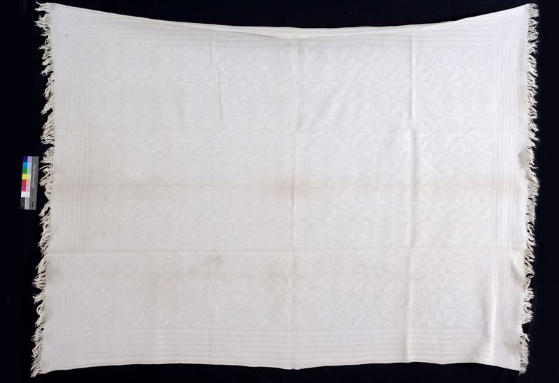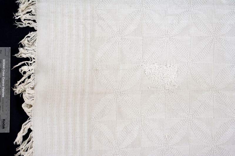 Sängöverkast, maskinvävd av grovt vitt bomullsgarn. Kantbårder av