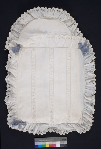 vita broderier samt av blå sidenband. Madrassen rektangulär med övre
