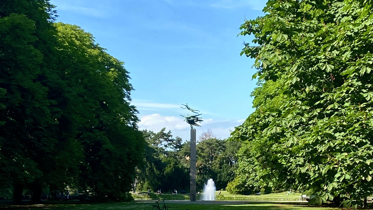 "Den här bilden visar en staty, en liten fontän, och träd i Slottsparken i Malmö. Jag gillar att promenera med mina kompisar och läsa böcker i den här parken."