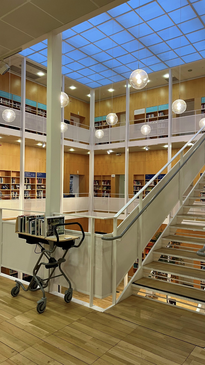 "Bilden är tagen i Malmö stadsbiblioteket. I bilden kan man se flera hyllor fyllda av böcker."