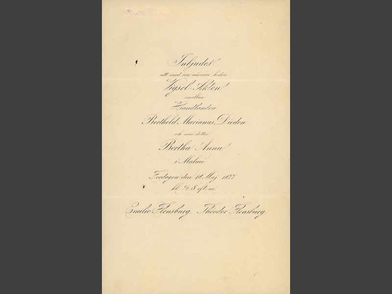 Inbjudan lyder: Inbjudes / att med sin närvaro hedra / Vigsel=Akten / emellan / Handlanden / Berthold Marianus Dieden / och wår