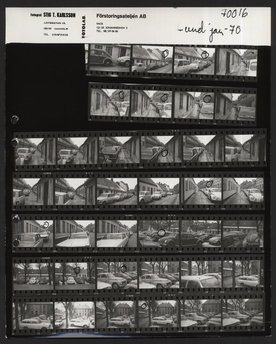 MM 062945:070016 :: bilar, gata, snö, väg, stad, bil, vägar, gator, parkeringar, parkering, städer, träd