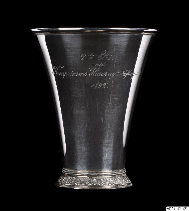 - Pokal (pris) av silver, gjuten dekor. Graverad inskrift på sidan: 2:dra Pris vid Kronprinsens Husarreg:tes täflingsridt 1892. Stämplar i botten: C G HALLBERG (avritad stämpel i form av tre kronor), och O6 Rund botten med bladlist uppåt klocklikt utvidgad kupa. Invändigt förgylld (?).