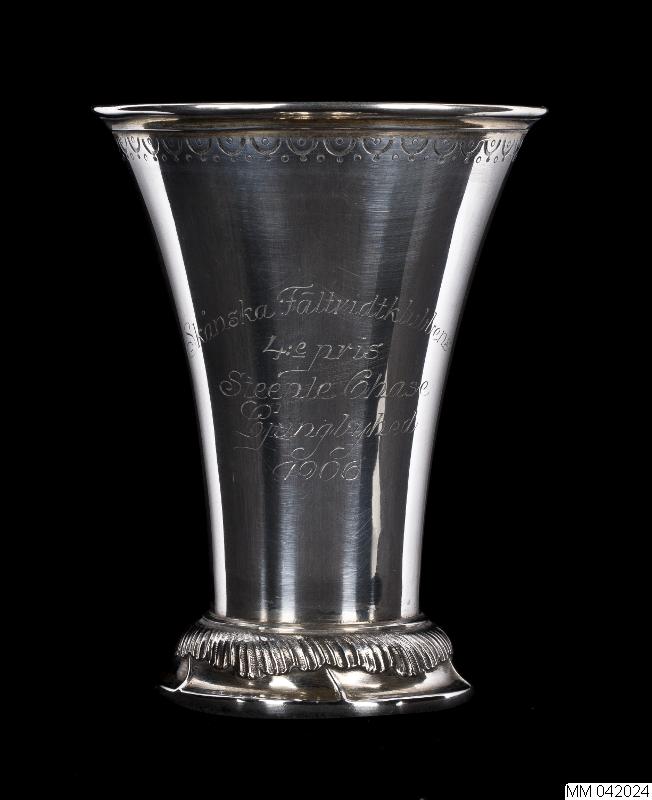 Graverad inskrift: Skånska Fältridtklubbens 4:e pris, Steeple Chase