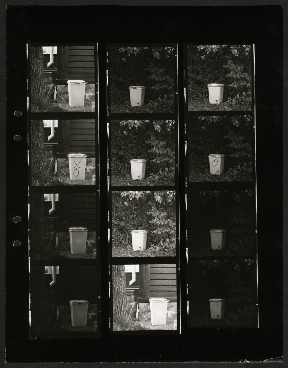 MM 062945:F:000685 :: plast, natur, exteriör, soptunna, soptunnor, avfallstunnor, hus, avfallstunna, skog, utemiljö, träd
