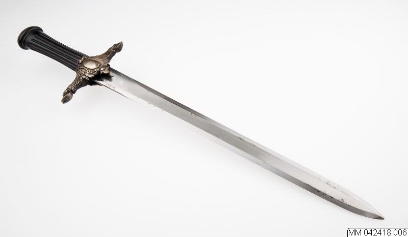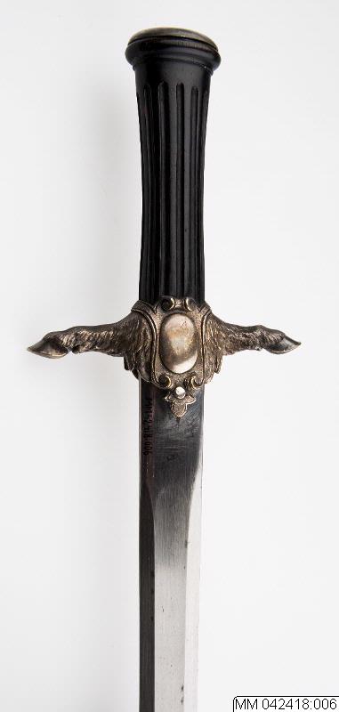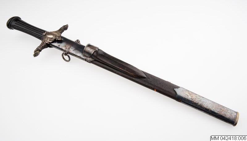 Hirschfänger till hovjägmästare. Tillhörande balja har inventarienummer MM 42418:007.