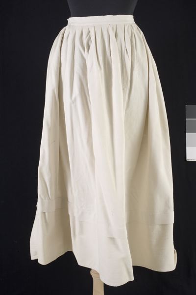 Underkjol av vitt, hemvävt, kypertbundet bomullstyg. Sydd av 4 raka våder. (Vådbredd 69 cm) Lagda veck mot en 3 cm bred linning. Sprund bak som knyts med vita bomullsband. Nertill ett horisontellt veck och därefter är vart 5:te inslag i väven betydligt grövre de sista 25 cm. Handsydd.