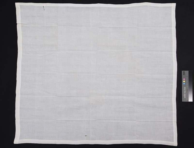 Sorgdok av vit sockerduk. Handfållad med en drygt 2 cm bred fåll.