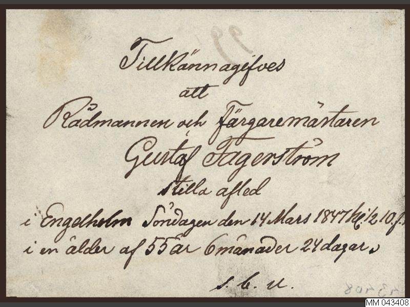 Färgaremästaren/Gustaf Fagerström/stilla afled/i Engelholm Söndagen den