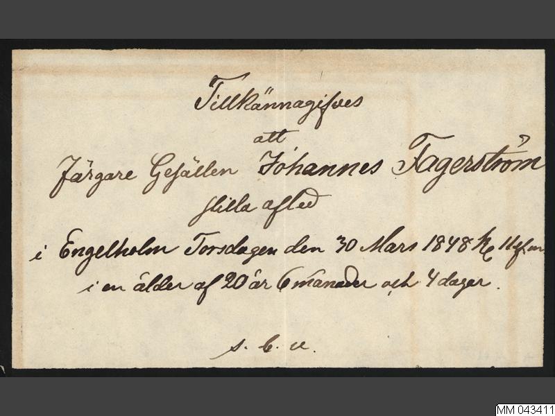 "Tillkännagifves/att /Färgare Gesällen Johannes Fagerström/ stilla