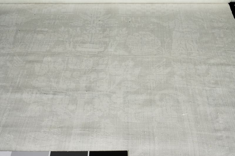 Servett av vit linnedamast. Varp: 25 trådar per cm. Insl. 25 trådar per cm. Vävnaden gles. Framskaft: