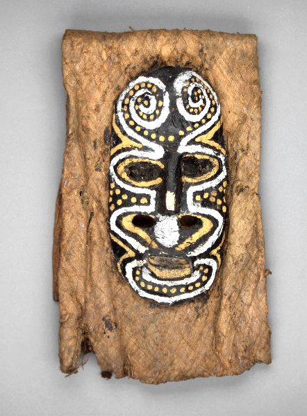 Avlång dansmask (toóri) monterad på barktyg och målad med jordfärger