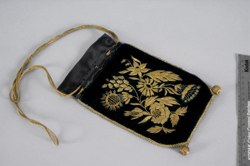 Väska av grön sammet reliefbroderier av guldtråd, guldlan, spiraltråd